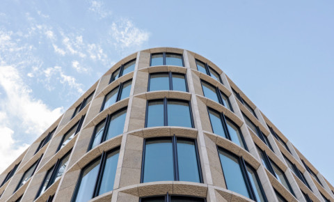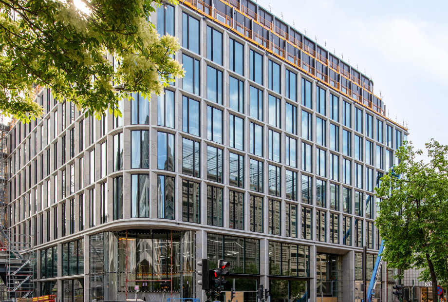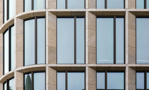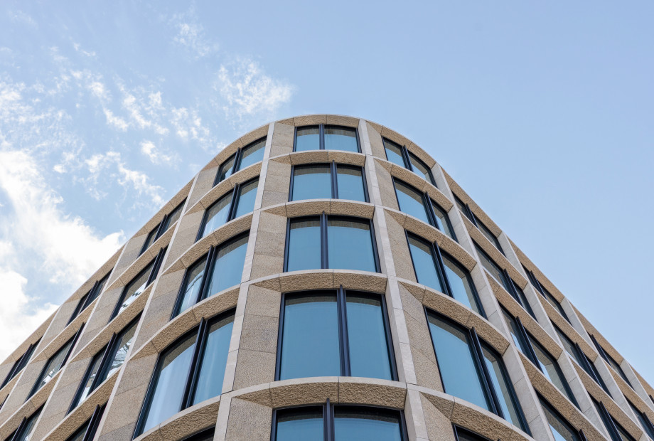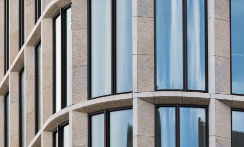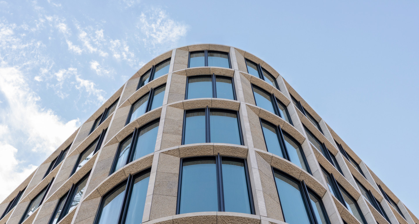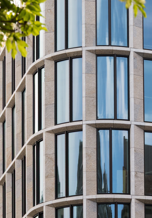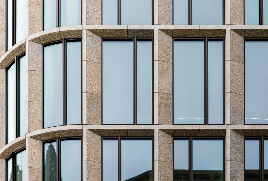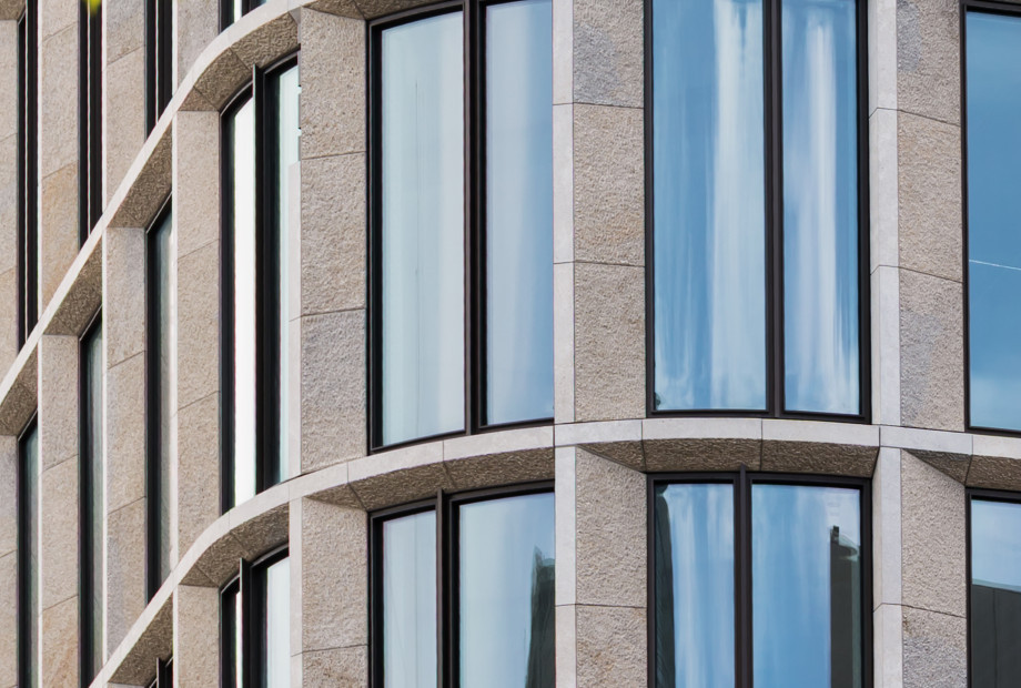 - Curved elements: Each façade type included rounded corners, resulting in bent glazing, stone clad, and substructures – each requiring high precision and coordination.